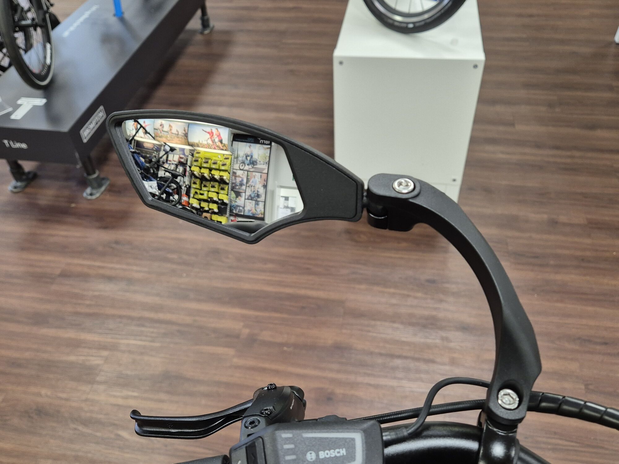 Einfach die Bosch Bedienung etwas nach außen setzten und den Rückspiegel innen anbringen. Fertig.