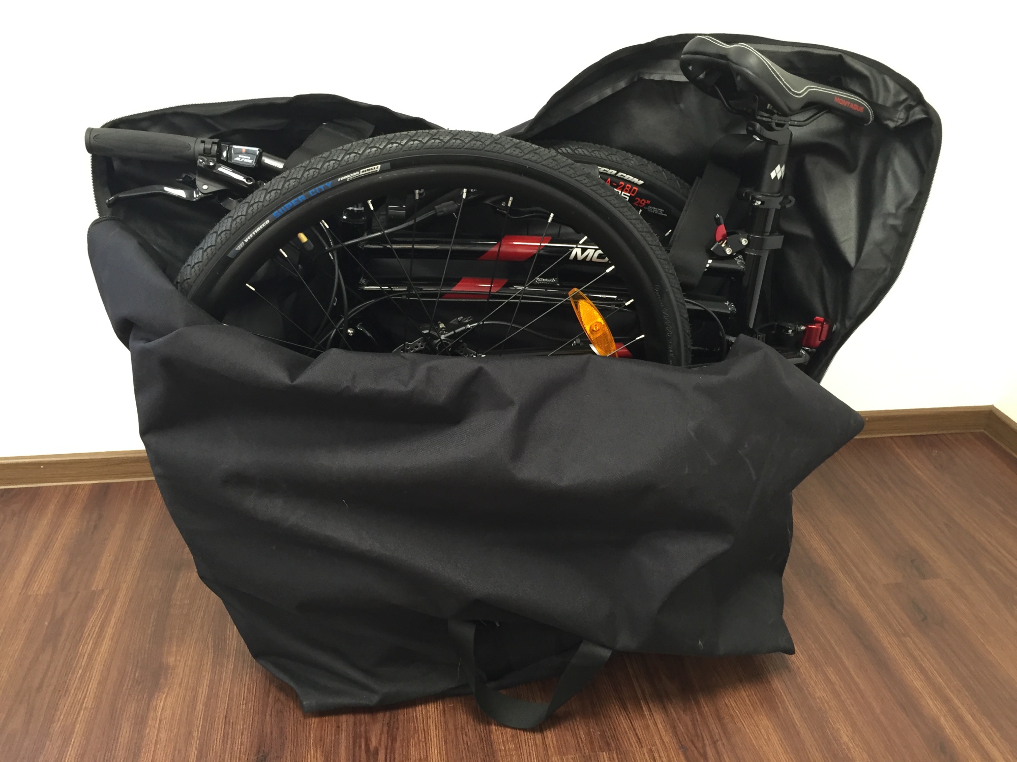In dieser Transporttasche ist Ihr MONTAGUE-Faltrad bzw. das SWISBBIKE gut geschützt! Die Tasche ist aus hochwertigem, reißfestem Cortura-Stoff gefertigt. Sie besitzt ein Innenfach für das Vorderrad und einen Schulterriemen. Abweichend von der Abbildung befindet sich kein Schriftzug „MONTAGUE“ auf der Tasche.