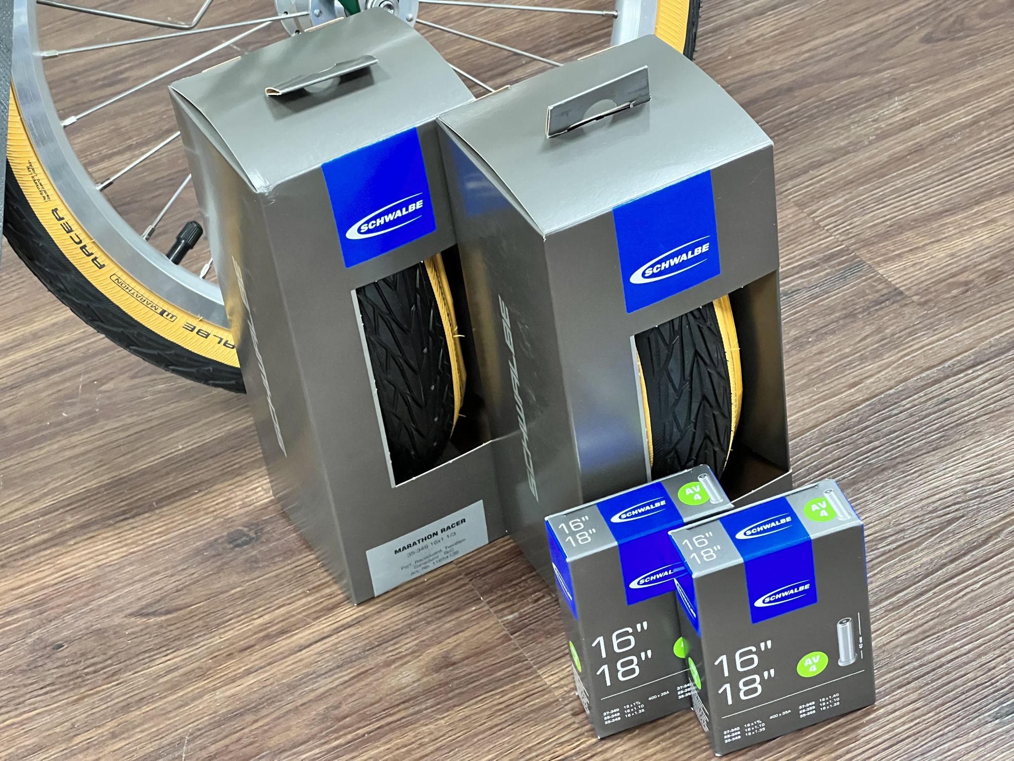 Hier erhalten Sie Design Set: 2x Schwalbe Marathon Racer Reifen in der Farbe Tanwall passend für Brompton 2x Schwalbe Schläuche passend.