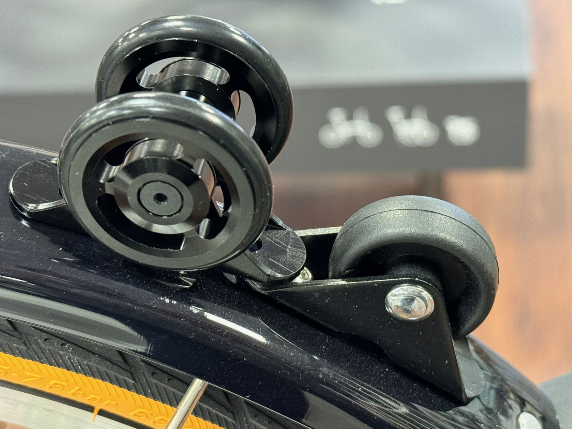Hier mal wieder ein kleiner Hingucker für Dein Brompton. Die gelieferte Rolle ersetzt die Kunstoffrolle , die auf dem hinteren Schutzblech am Brompton montiert ist. Sie macht einen sehr wertigen Eindruck und rollt auch besser als das Original von Brompton.