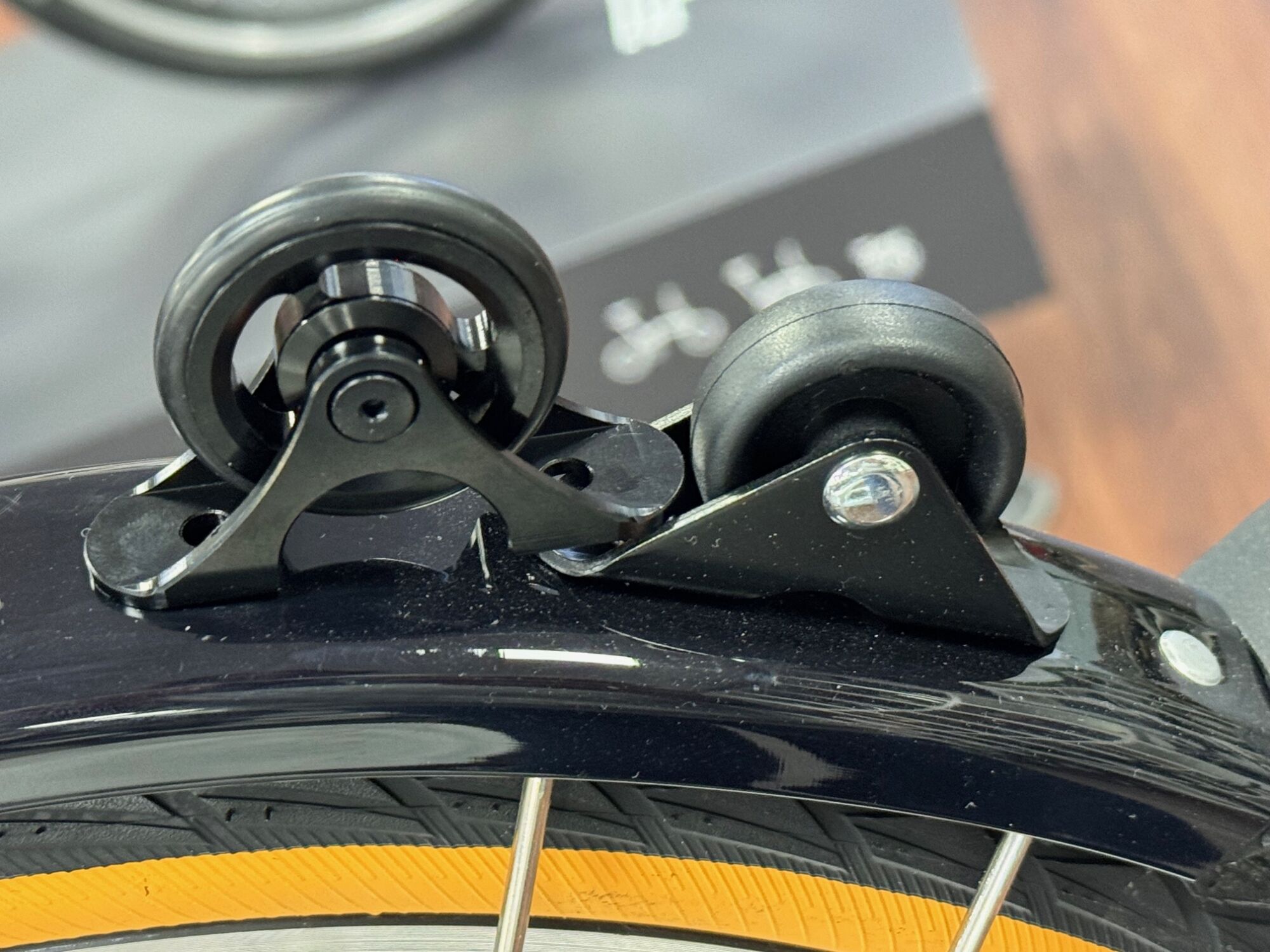 Hier mal wieder ein kleiner Hingucker für Dein Brompton. Die gelieferte Rolle ersetzt die Kunstoffrolle , die auf dem hinteren Schutzblech am Brompton montiert ist. Sie macht einen sehr wertigen Eindruck und rollt auch besser als das Original von Brompton.